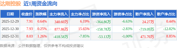 资金流向数据方面,本周达刚控股主力资金合计净流入799.89万元,游资资金合计净流出576.77万元,散户资金合计净流出223.12万元。本周资金流向一览见下表: