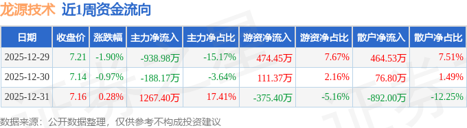 资金流向数据方面,本周龙源技术主力资金合计净流入140.26万元,游资资金合计净流入210.41万元,散户资金合计净流出350.67万元。本周资金流向一览见下表: