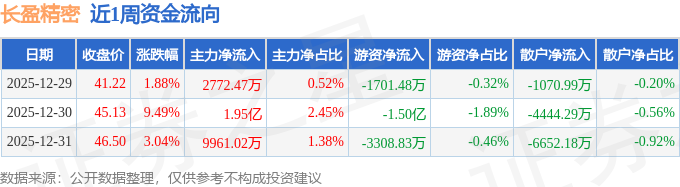 证券之星消息,截至2025年12月31日收盘,长盈精密(300115)报收于46.5元,较上周的40.46元上涨14.93%。本周,长盈精密12月30日盘中最高价报47.99元,股价触及近一年最高点。12月29日盘中最低价报39.6元。长盈精密当前最新总市值632.81亿元,在消费电子板块市值排名10/90,在两市A股市值排名281/5181。