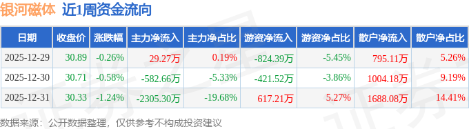 资金流向数据方面,本周银河磁体主力资金合计净流出2858.68万元,游资资金合计净流出628.7万元,散户资金合计净流入3487.38万元。本周资金流向一览见下表: