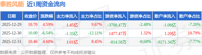 资金流向数据方面,本周泰胜风能主力资金合计净流入1.1亿元,游资资金合计净流出3045.58万元,散户资金合计净流出7989.75万元。本周资金流向一览见下表: