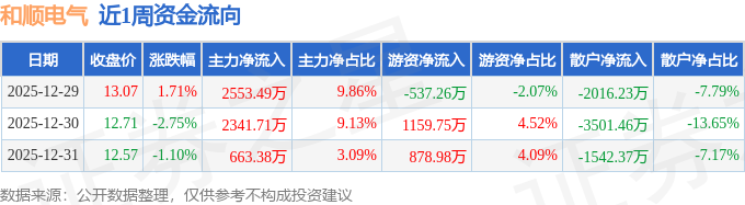 资金流向数据方面,本周和顺电气主力资金合计净流入5558.59万元,游资资金合计净流入1501.47万元,散户资金合计净流出7060.06万元。本周资金流向一览见下表: