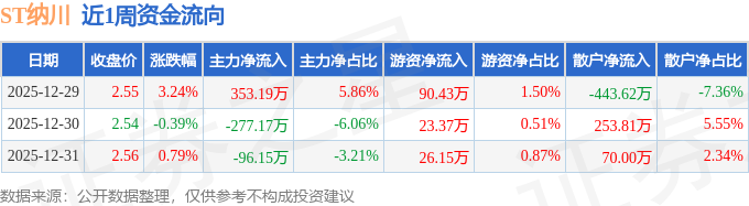 资金流向数据方面,本周ST纳川主力资金合计净流出20.13万元,游资资金合计净流入139.95万元,散户资金合计净流出119.82万元。本周资金流向一览见下表: