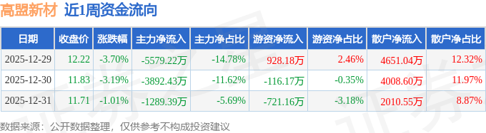 资金流向数据方面,本周高盟新材主力资金合计净流出1.08亿元,游资资金合计净流入90.85万元,散户资金合计净流入1.07亿元。本周资金流向一览见下表: