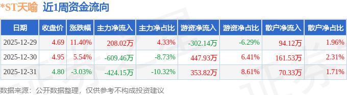 资金流向数据方面,本周*ST天喻主力资金合计净流出825.59万元,游资资金合计净流入499.62万元,散户资金合计净流入325.97万元。本周资金流向一览见下表: