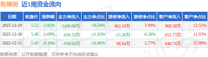 资金流向数据方面,本周有棵树主力资金合计净流出3006.88万元,游资资金合计净流入545.84万元,散户资金合计净流入2461.04万元。本周资金流向一览见下表: