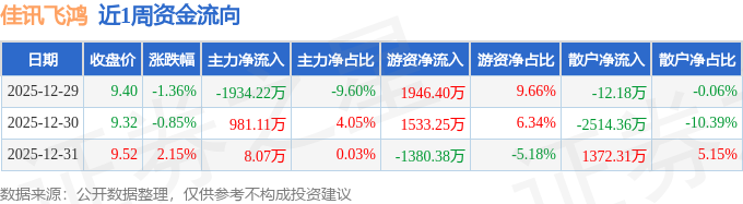 资金流向数据方面,本周佳讯飞鸿主力资金合计净流出945.04万元,游资资金合计净流入2099.27万元,散户资金合计净流出1154.23万元。本周资金流向一览见下表: