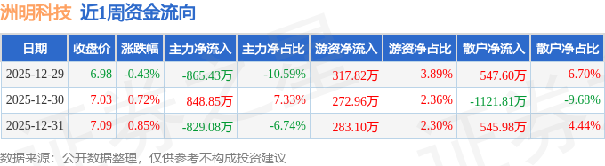 资金流向数据方面,本周洲明科技主力资金合计净流出845.65万元,游资资金合计净流入873.88万元,散户资金合计净流出28.22万元。本周资金流向一览见下表:
