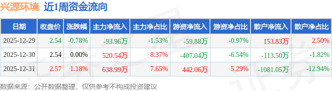 资金流向数据方面,本周兴源环境主力资金合计净流入1065.57万元,游资资金合计净流出24.86万元,散户资金合计净流出1040.71万元。本周资金流向一览见下表: