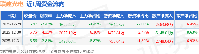 资金流向数据方面,本周联建光电主力资金合计净流出1520.91万元,游资资金合计净流入1457.2万元,散户资金合计净流入63.71万元。本周资金流向一览见下表: