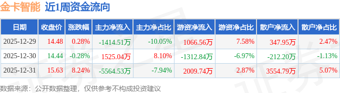 资金流向数据方面,本周金卡智能主力资金合计净流出5454.01万元,游资资金合计净流入1763.47万元,散户资金合计净流入3690.54万元。本周资金流向一览见下表:
