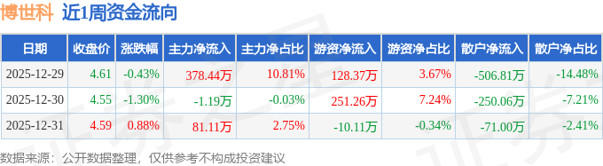 资金流向数据方面,本周博世科主力资金合计净流入458.35万元,游资资金合计净流入369.52万元,散户资金合计净流出827.87万元。本周资金流向一览见下表: