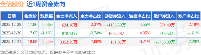 资金流向数据方面,本周全信股份主力资金合计净流入3098.55万元,游资资金合计净流入297.59万元,散户资金合计净流出3396.13万元。本周资金流向一览见下表: