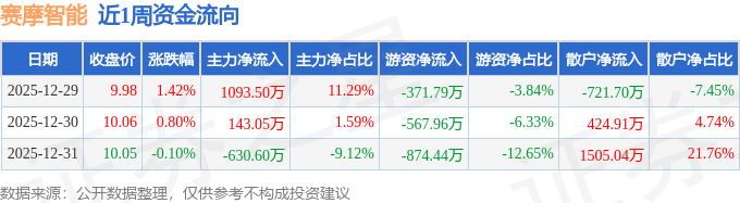 资金流向数据方面,本周赛摩智能主力资金合计净流入605.95万元,游资资金合计净流出1814.2万元,散户资金合计净流入1208.25万元。本周资金流向一览见下表: