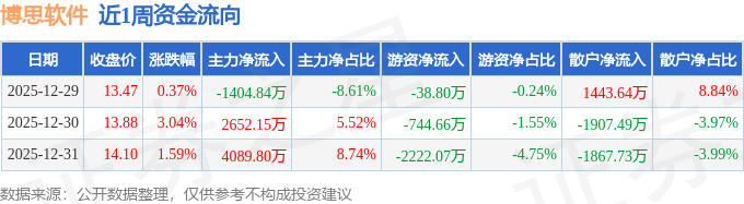 资金流向数据方面,本周博思软件主力资金合计净流入5337.11万元,游资资金合计净流出3005.53万元,散户资金合计净流出2331.59万元。本周资金流向一览见下表: