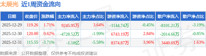 资金流向数据方面,本周太辰光主力资金合计净流出7298.13万元,游资资金合计净流入1.4亿元,散户资金合计净流出6675.19万元。本周资金流向一览见下表: