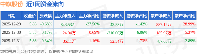 资金流向数据方面,本周中旗股份主力资金合计净流出784.38万元,游资资金合计净流出201.05万元,散户资金合计净流入985.43万元。本周资金流向一览见下表: