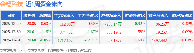 资金流向数据方面,本周会畅科技主力资金合计净流出1979.17万元,游资资金合计净流入371.22万元,散户资金合计净流入1607.95万元。本周资金流向一览见下表: