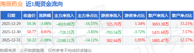 资金流向数据方面,本周海辰药业主力资金合计净流出6935.34万元,游资资金合计净流出75.2万元,散户资金合计净流入7010.53万元。本周资金流向一览见下表: