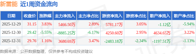 资金流向数据方面,本周新雷能主力资金合计净流入261.95万元,游资资金合计净流入7548.59万元,散户资金合计净流出7810.53万元。本周资金流向一览见下表: