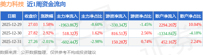 资金流向数据方面,本周美力科技主力资金合计净流出2047.97万元,游资资金合计净流入636.45万元,散户资金合计净流入1411.52万元。本周资金流向一览见下表: