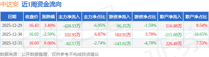 资金流向数据方面,本周中达安主力资金合计净流出170.16万元,游资资金合计净流出57.33万元,散户资金合计净流入227.49万元。本周资金流向一览见下表: