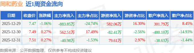 证券之星消息,截至2025年12月31日收盘,同和药业(300636)报收于7.51元,较上周的7.55元下跌0.53%。本周,同和药业12月29日盘中最高价报7.55元。12月30日盘中最低价报7.4元。同和药业当前最新总市值31.54亿元,在化学制药板块市值排名131/150,在两市A股市值排名4437/5181。