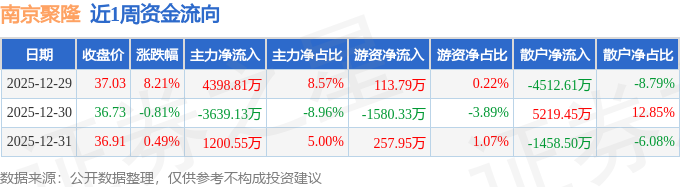 资金流向数据方面,本周南京聚隆主力资金合计净流入1960.24万元,游资资金合计净流出1208.58万元,散户资金合计净流出751.66万元。本周资金流向一览见下表: