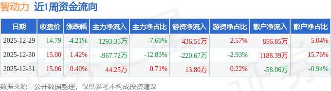 资金流向数据方面,本周智动力主力资金合计净流出2216.82万元,游资资金合计净流入229.64万元,散户资金合计净流入1987.18万元。本周资金流向一览见下表:
