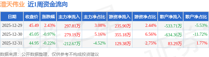 资金流向数据方面,本周澄天伟业主力资金合计净流入364.32万元,游资资金合计净流入720.46万元,散户资金合计净流出1084.79万元。本周资金流向一览见下表: