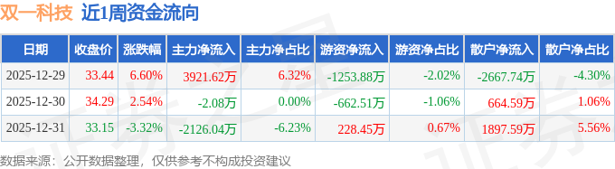 资金流向数据方面,本周双一科技主力资金合计净流入1793.5万元,游资资金合计净流出1687.93万元,散户资金合计净流出105.56万元。本周资金流向一览见下表: