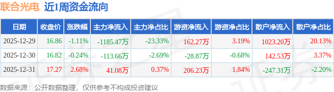 资金流向数据方面,本周联合光电主力资金合计净流出1258.06万元,游资资金合计净流入339.63万元,散户资金合计净流入918.42万元。本周资金流向一览见下表: