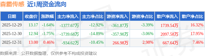 资金流向数据方面,本周森霸传感主力资金合计净流出4051.97万元,游资资金合计净流出452.79万元,散户资金合计净流入4504.76万元。本周资金流向一览见下表: