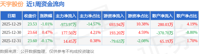 资金流向数据方面,本周天宇股份主力资金合计净流出782.02万元,游资资金合计净流入807.5万元,散户资金合计净流出25.48万元。本周资金流向一览见下表: