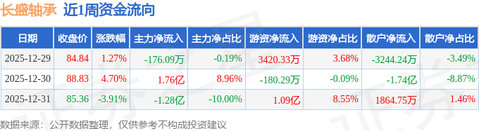 资金流向数据方面,本周长盛轴承主力资金合计净流入4588.66万元,游资资金合计净流入1.42亿元,散户资金合计净流出1.88亿元。本周资金流向一览见下表: