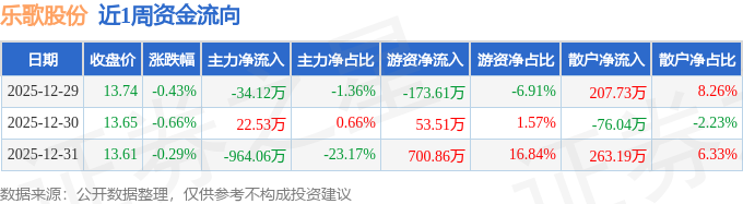 沪深股通持股方面,截止2025年12月31日收盘,乐歌股份深股通持股数为128.15万股,占流通股比为44.0%。