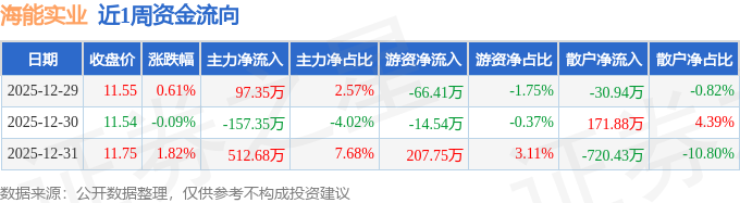 资金流向数据方面,本周海能实业主力资金合计净流入452.69万元,游资资金合计净流入126.8万元,散户资金合计净流出579.49万元。本周资金流向一览见下表: