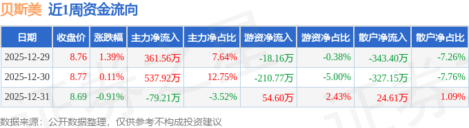 资金流向数据方面,本周贝斯美主力资金合计净流入820.27万元,游资资金合计净流出174.33万元,散户资金合计净流出645.94万元。本周资金流向一览见下表: