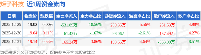 资金流向数据方面,本周矩子科技主力资金合计净流出428.07万元,游资资金合计净流入382.96万元,散户资金合计净流入45.11万元。本周资金流向一览见下表: