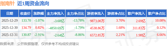 资金流向数据方面,本周指南针主力资金合计净流出6.81亿元,游资资金合计净流入2.1亿元,散户资金合计净流入4.71亿元。本周资金流向一览见下表:
