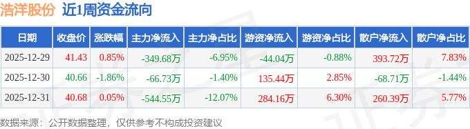 资金流向数据方面,本周浩洋股份主力资金合计净流出960.95万元,游资资金合计净流入375.56万元,散户资金合计净流入585.4万元。本周资金流向一览见下表: