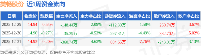 资金流向数据方面,本周美畅股份主力资金合计净流出544.57万元,游资资金合计净流入195.03万元,散户资金合计净流入349.53万元。本周资金流向一览见下表: