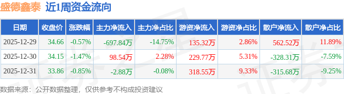 资金流向数据方面,本周盛德鑫泰主力资金合计净流出602.18万元,游资资金合计净流入683.65万元,散户资金合计净流出81.47万元。本周资金流向一览见下表: