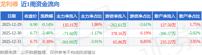 资金流向数据方面,本周龙利得主力资金合计净流出237.57万元,游资资金合计净流入181.41万元,散户资金合计净流入56.15万元。本周资金流向一览见下表: