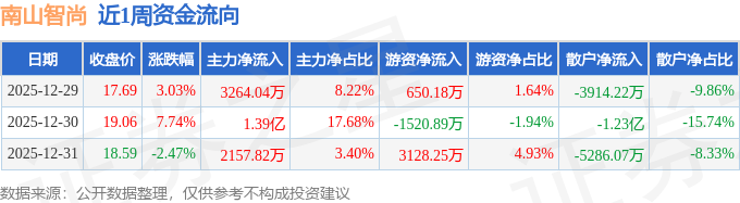 资金流向数据方面,本周南山智尚主力资金合计净流入1.93亿元,游资资金合计净流入2257.53万元,散户资金合计净流出2.15亿元。本周资金流向一览见下表: