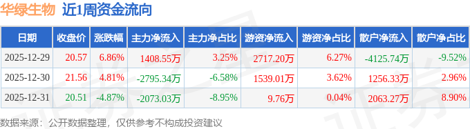 资金流向数据方面,本周华绿生物主力资金合计净流出3459.83万元,游资资金合计净流入4265.96万元,散户资金合计净流出806.14万元。本周资金流向一览见下表: