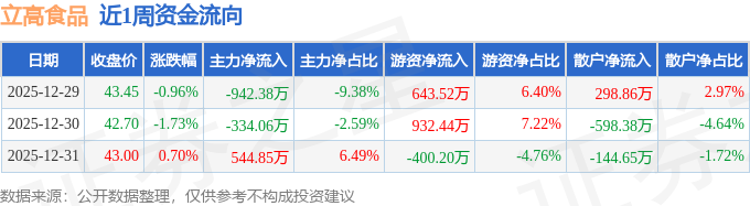 资金流向数据方面,本周立高食品主力资金合计净流出731.59万元,游资资金合计净流入1175.77万元,散户资金合计净流出444.18万元。本周资金流向一览见下表: