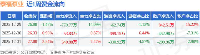 资金流向数据方面,本周泰福泵业主力资金合计净流出185.06万元,游资资金合计净流入5.49万元,散户资金合计净流入179.57万元。本周资金流向一览见下表: