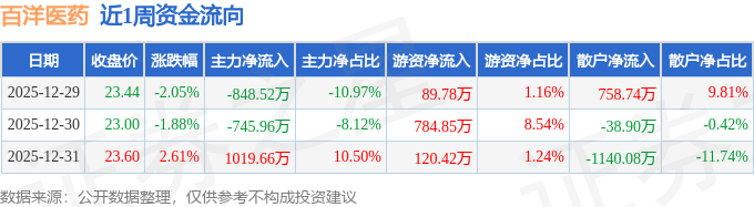 资金流向数据方面,本周百洋医药主力资金合计净流出574.82万元,游资资金合计净流入995.06万元,散户资金合计净流出420.24万元。本周资金流向一览见下表: