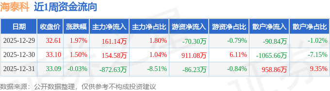 资金流向数据方面,本周海泰科主力资金合计净流出556.91万元,游资资金合计净流入754.56万元,散户资金合计净流出197.64万元。本周资金流向一览见下表: